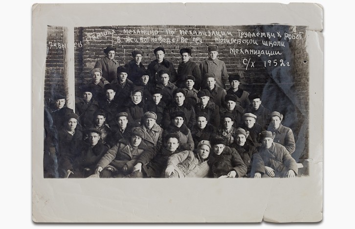 1952, kurs mechaników, piąty od prawej w drugim rzędzie: Tomasz Aleks (ojciec Tamary Aleks)