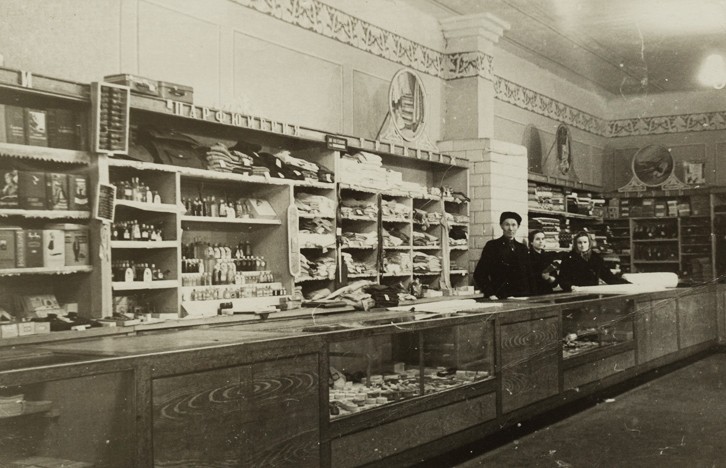 1958, sklep w którym pracowali rodzice Heleny Hańko, pierwszy: Jan Dorosz, Wiera Łoszakowa, Jadwiga Dorosz