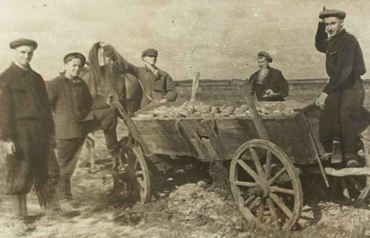 1959, uczniowie na wykopkach, od prawej: Józef Dorosz, dalej koledzy, z lewej Gerard Płachetko