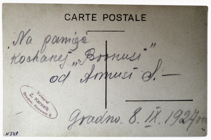 8 września 1927 roku, Grodno, zakład Z. Karasika, podpis po polsku: „Na pamięć kochanej Bronusi od Anusi ”. Fotografia z kolekcji Alesia Gostiewa z Grodna(druga strona zdjęcia)