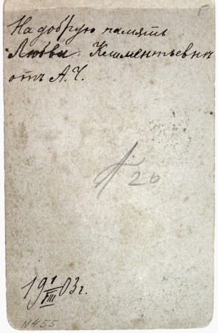 1 marca 1903 roku, Grodno, zakład M. Rubinszejna, podpis po rosyjsku „Na dobrą pamięć Lubie Kaszmieniewicz (?) od A. G. Fotografia z kolekcji Alesia Gostiewa z Grodna (druga strona zdjęcia)