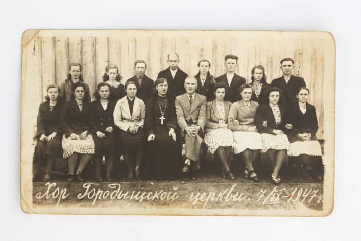 Wierchowicze. Fotografie z archiwum Niny Szpak. 7 września 1947 roku. Chór cerkwii w Gorobszczycach. Wykorzystywanie i udostepnianie fotografii z projektu „Fotohistorie Polaków z Białorusi – ocalanie domowych archiwów” tylko i wyłącznie po uzyskaniu pisemnej zgody. Projekt współfinansowanyw ramach sprawowania opieki Senatu Rzeczypospolitej Polskiej nad Polonią i Polakami za granicą w 2019 roku.