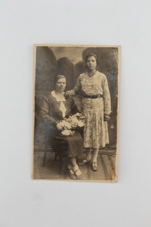 Amielianiec. Fotografie z archiwum Wiery Kusik z domu Mazuruk. Brak daty. Na zdjęciu stoi mama pani Wiery – Maria Mazuruk z domu Niedźwiedzka (ur. 1900 roku), obok siedzi jej koleżanka. Wykorzystywanie i udostepnianie fotografii z projektu „Fotohistorie Polaków z Białorusi – ocalanie domowych archiwów” tylko i wyłącznie po uzyskaniu pisemnej zgody. Projekt współfinansowanyw ramach sprawowania opieki Senatu Rzeczypospolitej Polskiej nad Polonią i Polakami za granicą w 2019 roku.