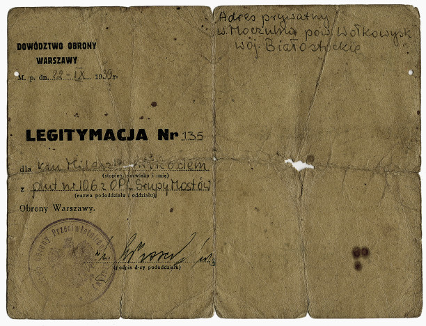 Legitymacja dziadka Nikodema Mialeszka, obrońcy Warszawy w 1939 roku. Z Warszawy trafił do obozu jenieckiego w Brześciu Litewskim. Oficerowie przetrzymywani w obozie wywożeni byli do Kozielska i Katynia. Nikodem wyskoczył z pociągu i pieszo doszed