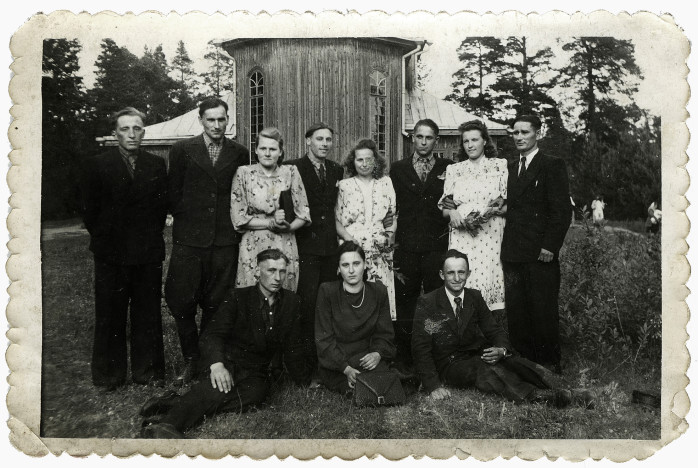 połowa lat 50. XX wieku, Narwieliszki, Litwa; trzeci stojący z prawej – Władysław Dagil, prawdopodobnie Zielone Świątki; Kościół należał do litewskiej diecezji, na święta przyjeżdżał litewski biskup, ale chodziło tutaj wielu wiernych zza białoruskiej granicy. T