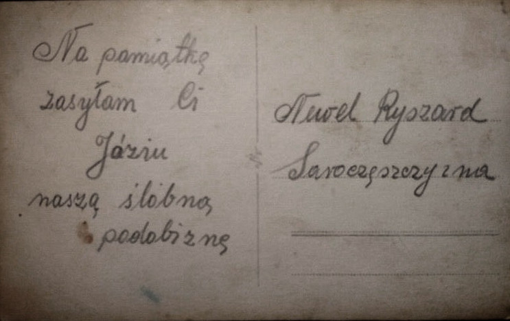 Lata 20. XX wieku, Grodno, podpis z tyłu po polsku: "Na pamiątkę zasyłam Ci Józiu naszą ślubną podobiznę. Newel Ryszard, Saroczęszczyzna” (druga strona zdjęcia)
