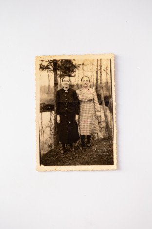 Wysokie Litewskie. Fotografie z archiwum Aliny Wasiluk. Lata 40. XX wieku. Na zdjęciu Walentyna i Jefrazimia Jakimiuk. Wykorzystywanie i udostepnianie fotografii z projektu „Fotohistorie Polaków z Białorusi – ocalanie domowych archiwów” tylko i wyłącznie po uzyskaniu pisemnej zgody. Projekt współfinansowanyw ramach sprawowania opieki Senatu Rzeczypospolitej Polskiej nad Polonią i Polakami za granicą w 2019 roku.
