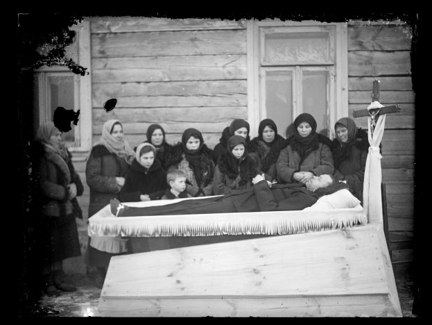 Etnograf uważa, że zdjęcia te robione były na chwilę przed tym zanim ruszył kondukt. Na pogrzeb przychodziła cała wieś, nie trzeba było być zaproszonym. Wystawiano trumnę przed dom, na chwilę otwierano wieko, żeby fotograf mógł zrobić pamiątkowe zdjęcie. Zwraca uwagę to, że wielu nieboszczyków nie ma butów.
