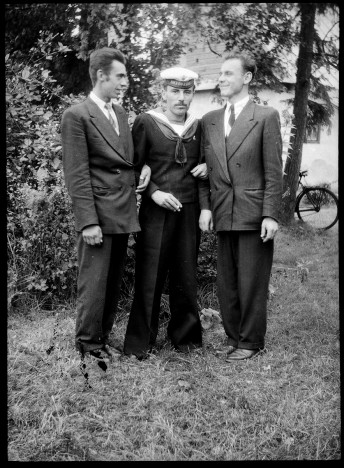 ok. 1970, portret trzech mężczyzn w plenerze, jeden z nich w mundurze marynarki wojennej