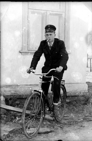 ok. 1950, portret mężczyzny w mundurze kolejarskim na rowerze